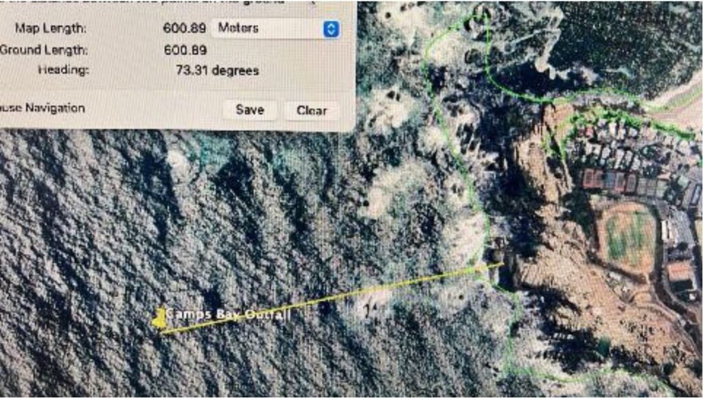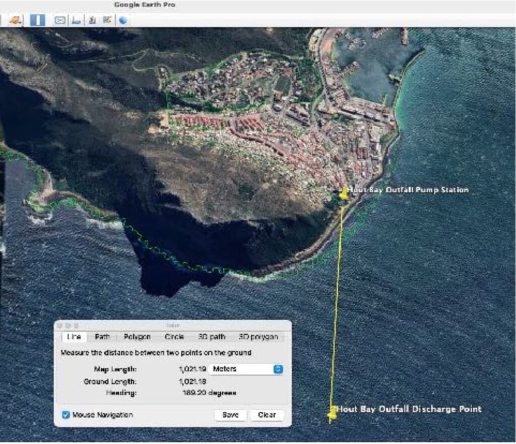 The Hout Bay permit states: “The total pipeline length is 2162m from the highwater mark” In fact, pipe length is not relevant. All that matters is the distance from the outfall discharge point, to the nearest shore. When one puts the outfall pump station co-ordinates, plus the discharge point co-ordinates, as on the outfall permits, into Google Earth, and use the Google Earth ruler to measure distances, the following is shown: • Hout Bay’s discharge point is only roughly 700m from the land, which is a nature reserve (and even closer to where surfers participate in the International Big Wave event at ‘Dungeons’ surf spot).