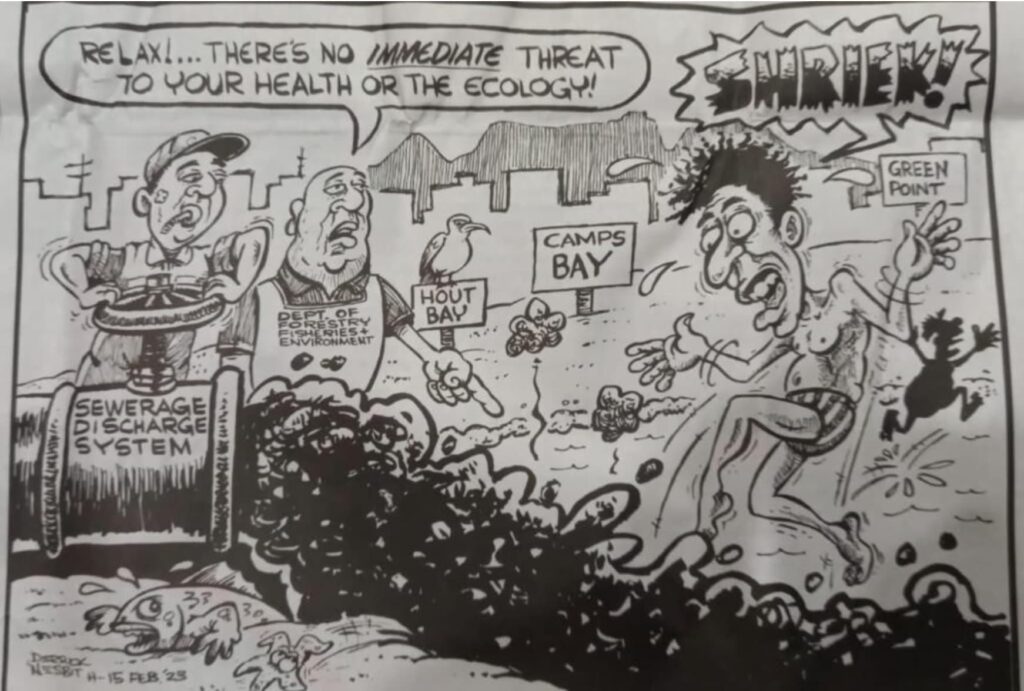 Government dumps Raw Sewage into the sea: Sewage pollution is everything we flush down the loo or wash down the drain that is released into the environment through sewer overflows, or that washes off the land and roads. The disposal of our sewage is the responsibility of the City of Cape Town government, which we pay for each month in our rates bill. And no the sea does not dilute it, the ocean holds it in the bays and the sealife suffer the consequences.