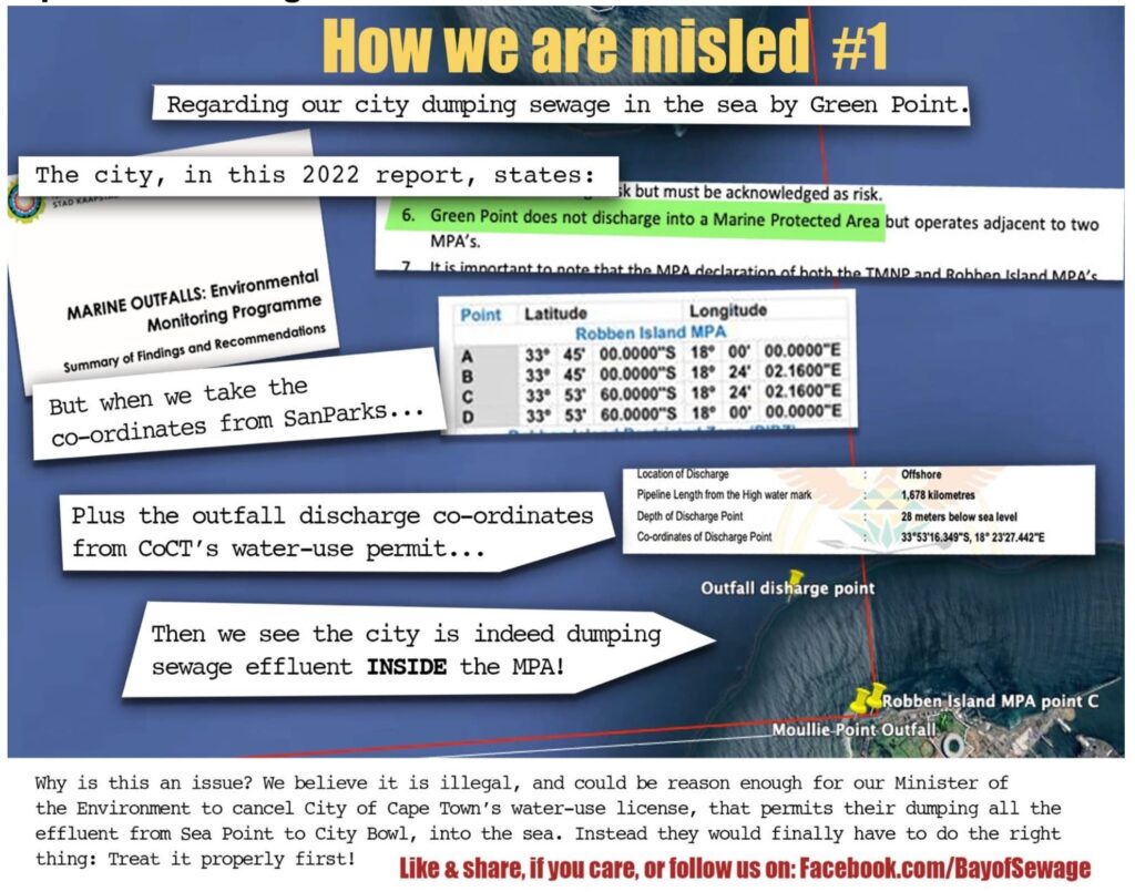 The 3 marine outfalls contribute to these contaminants in our bays and are a health risk to our marine protected areas, the ocean life and our communities. Each day a total of 55 million litres of Preliminary Raw Sewage is pumped into our bays made up from Hout Bay; Camps Bay and Green Point. Green Point MOP falls within the Robben Island Marine Protected Area and the TMNP, which is a violation to the permit issued by the national government.